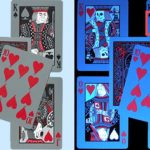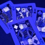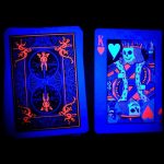 A deck of Bicycle playing cards with Tragic Faces design on Royalty Face Cards. Cards glow under black light.